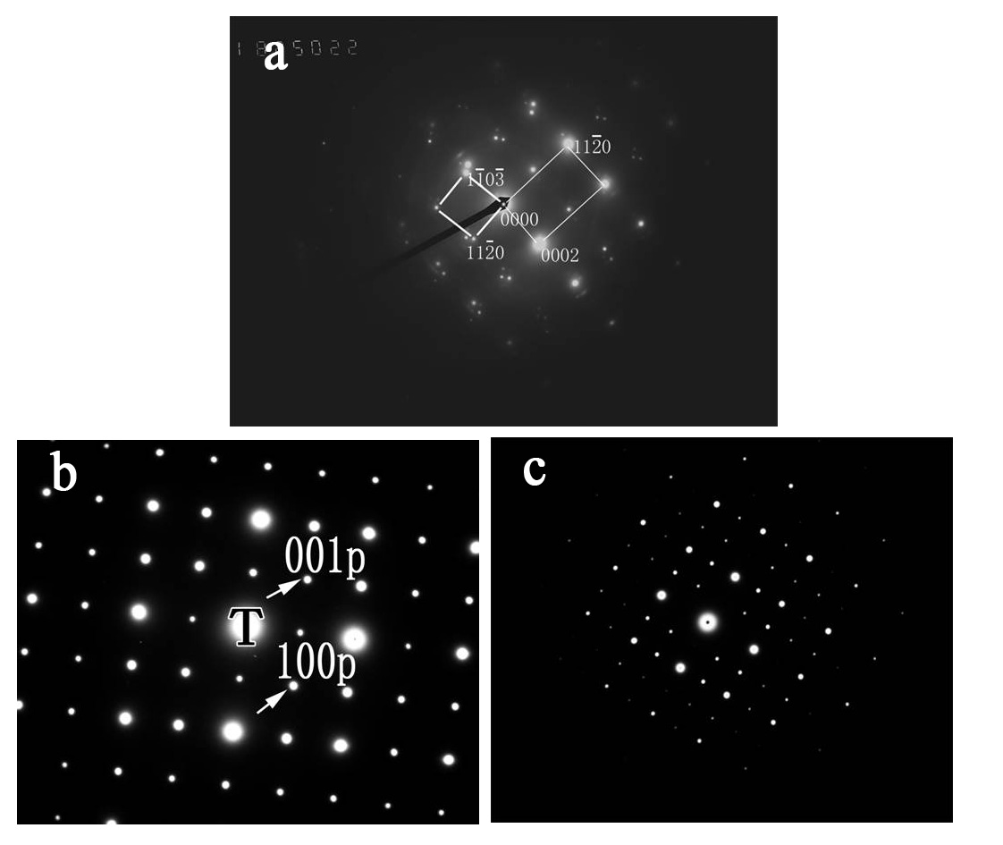 上图中图a和b是CaMgSi相中的(102)孪晶在不同位向下的孪晶花样,图c是CaMgSi相中另外一种孪晶的电子衍射花样,其孪晶面是(011)面;图d是镁中常见的(10-12)孪晶花样。
